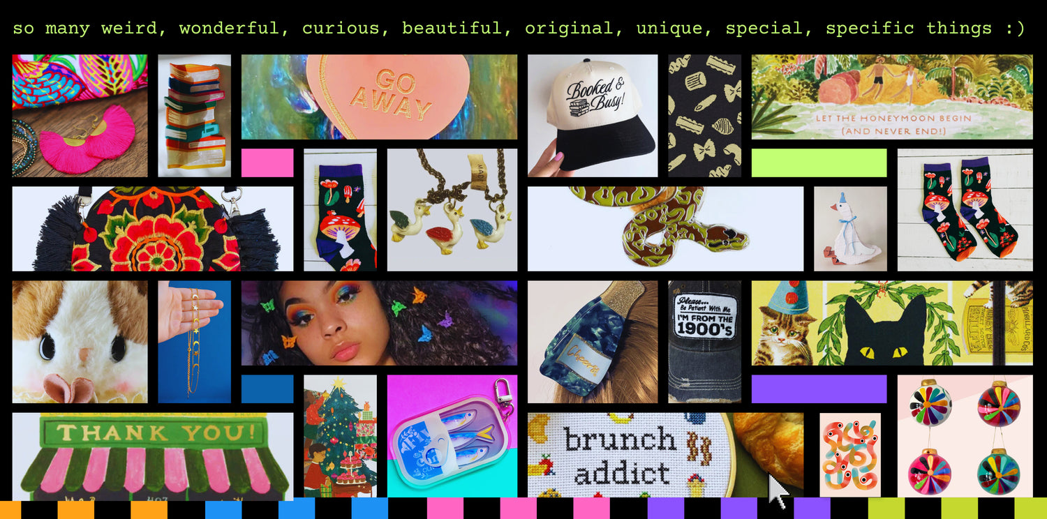Trinket gifts is an eclectic and unique gift shop for the loveable oddball in your life. It's an online store to find unique trinkets that are sure to dazzle and amuse. Whatever it is, it's fun. Treat yourself or your loved one to an odd, unique, or artist-made gift, specially selected for your gifting pleasure by our in-house illustrator (and sometimes designed by them!)