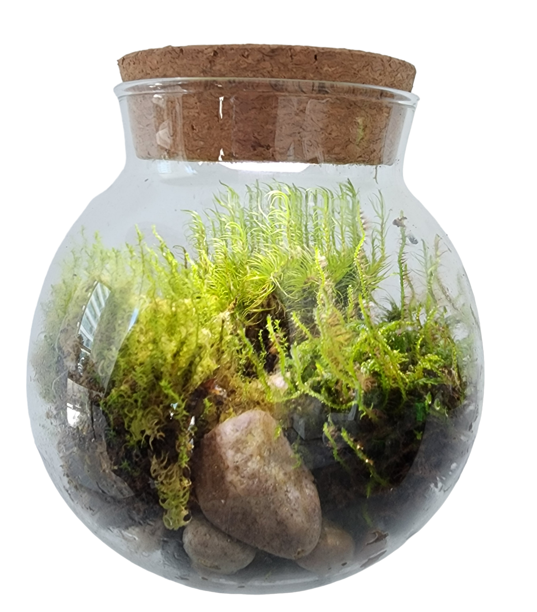 Create your own charming, lush, and calming moss garden. Effortlessly grow 3 kinds of different mosses with the included River Gravel and Accent Stones. Mosses are very adaptable, resilient, and easy to grow, requiring almost no maintenance or care after planting. They are natural stress relievers and purify the air. The high-quality glass planter is handmade and designed to completely contain the micro-climate to grow these fascinating specimens. The cork contains three bright LED accent lights to illuminate your creation. Your collection of Mosses will thrive for years in the included terrarium. Simply place your gravel, stones, and mosses. Then mist, cork, and enjoy for years to come!