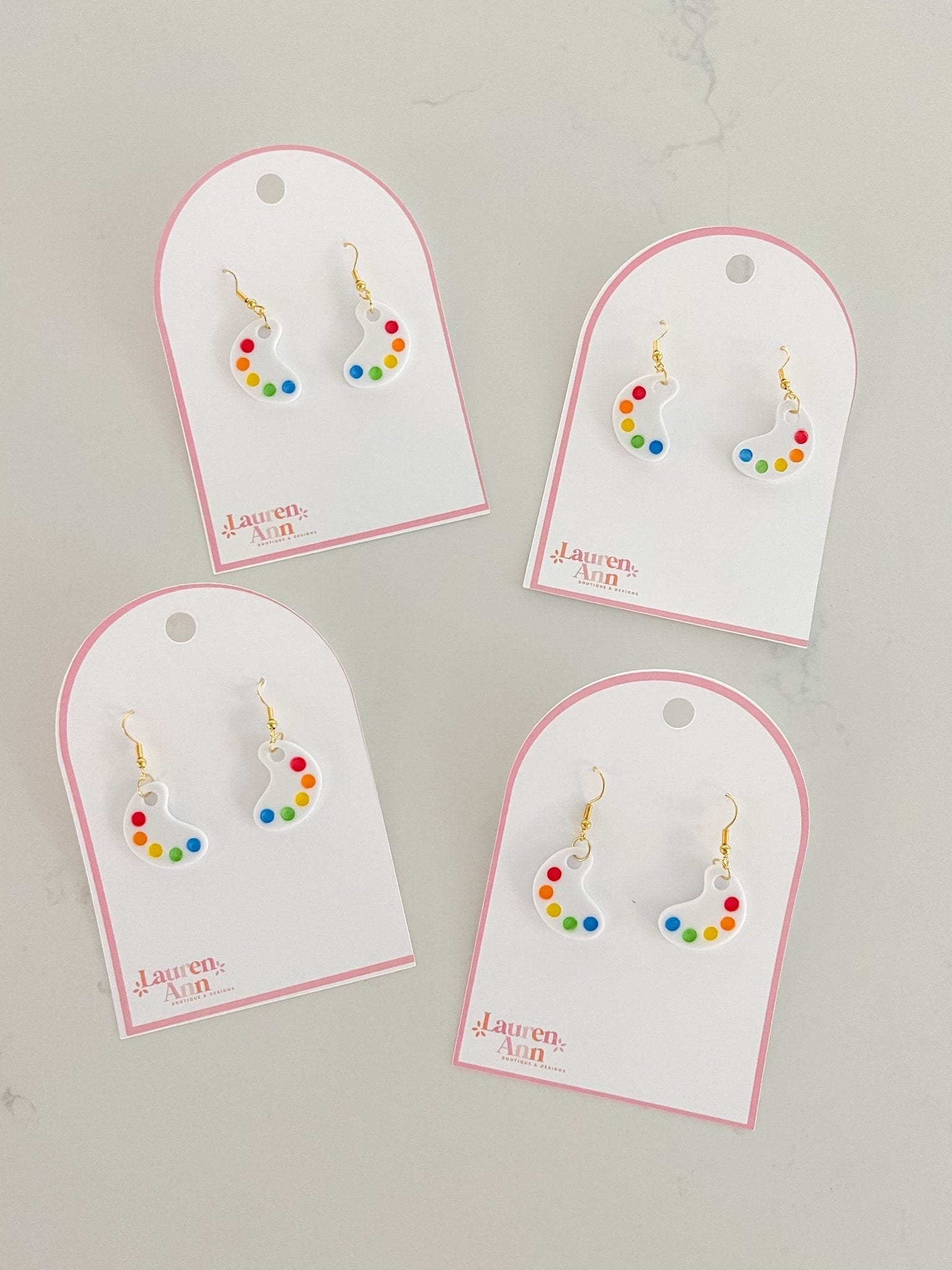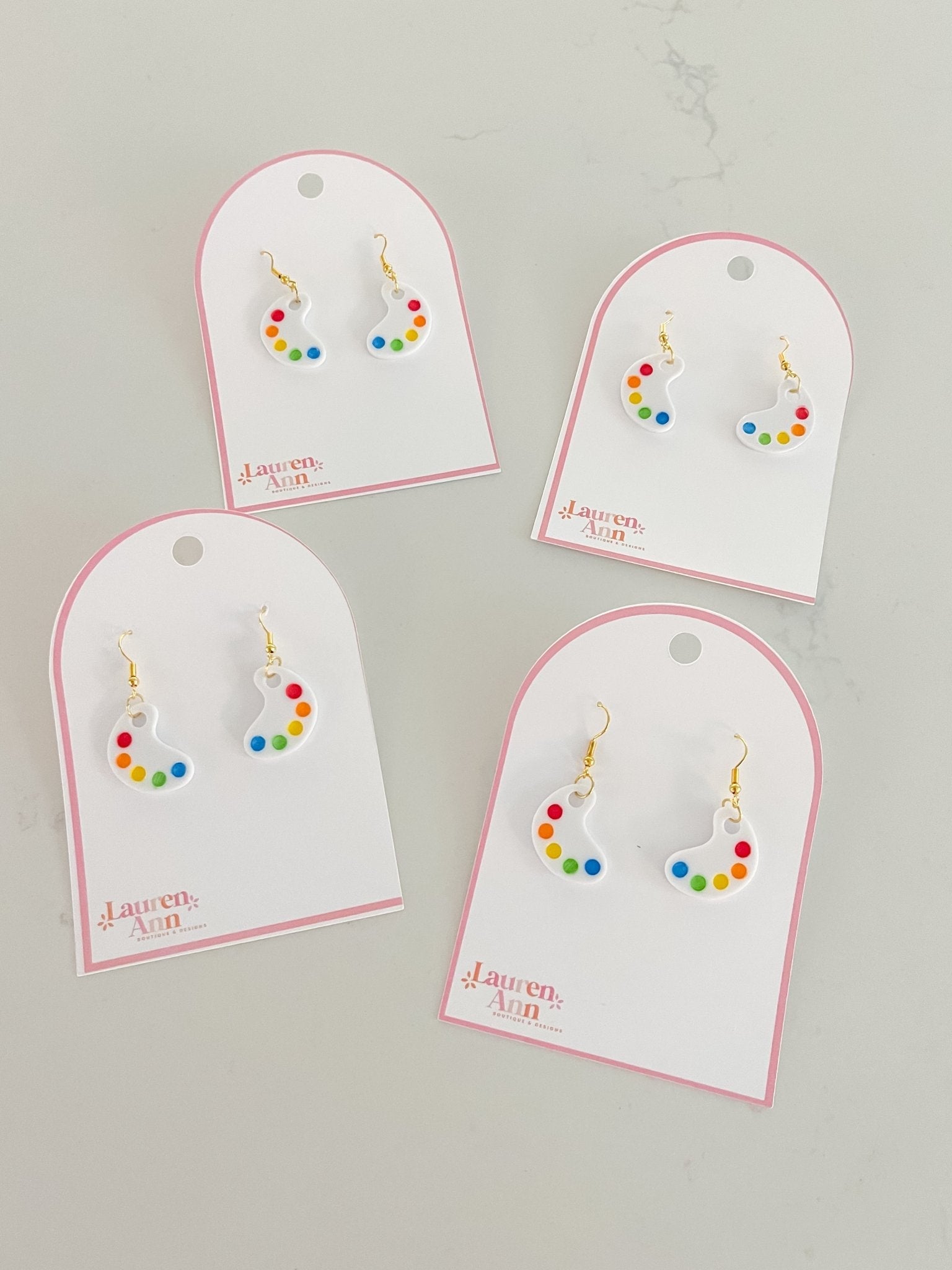 3D printed paint palette earrings, teacher earrings, teacher gifts, unique teacher gifts, art jewelry, teacher appreciation gift, handmade teacher earrings, eco-friendly earrings, teacher accessories, Etsy teacher gifts, art teacher gifts