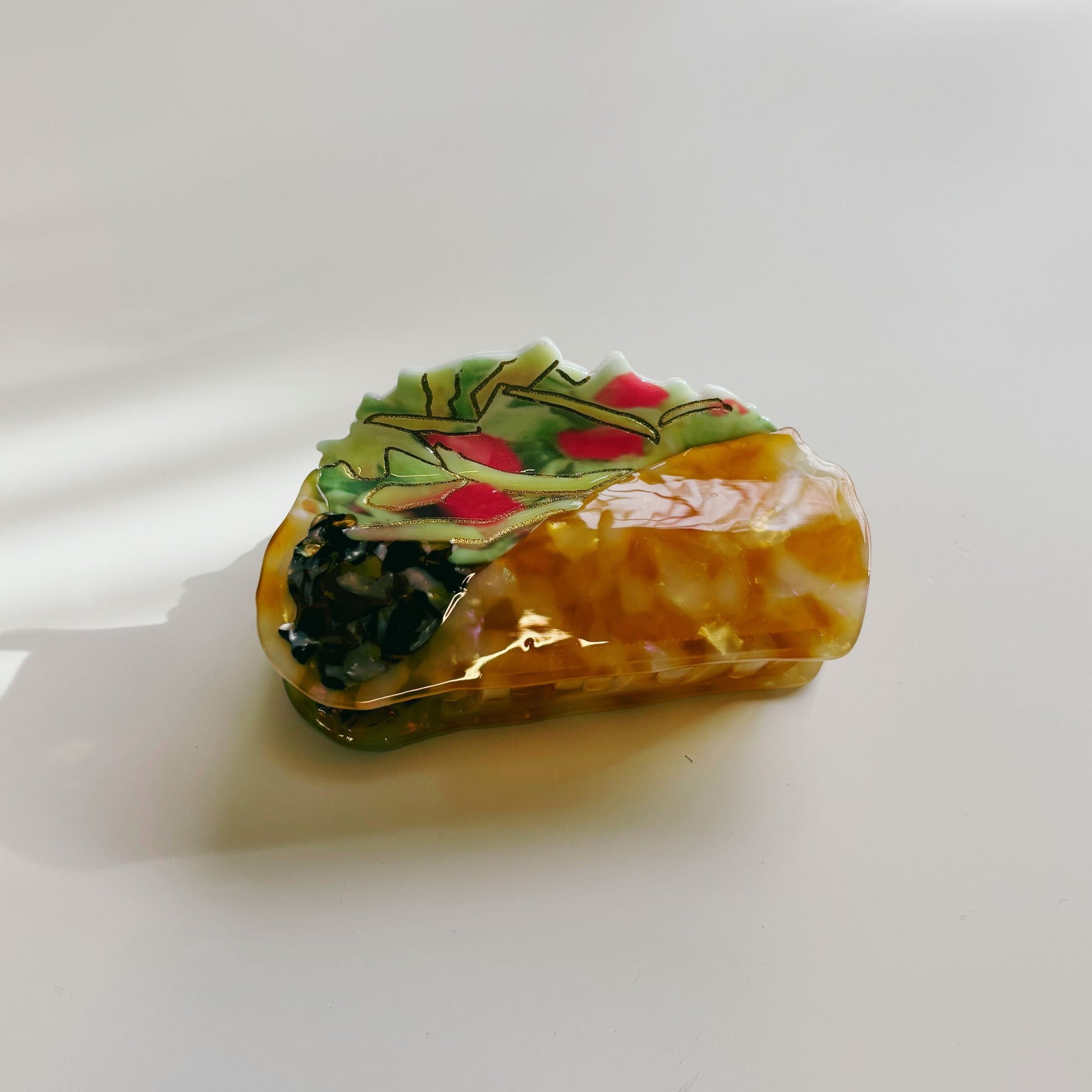 This charming hair clip looks just like a mini taco bursting with colorful toppings. Perfect for taco lovers and bold trendsetters alike, it securely holds your hair while serving up major style points.